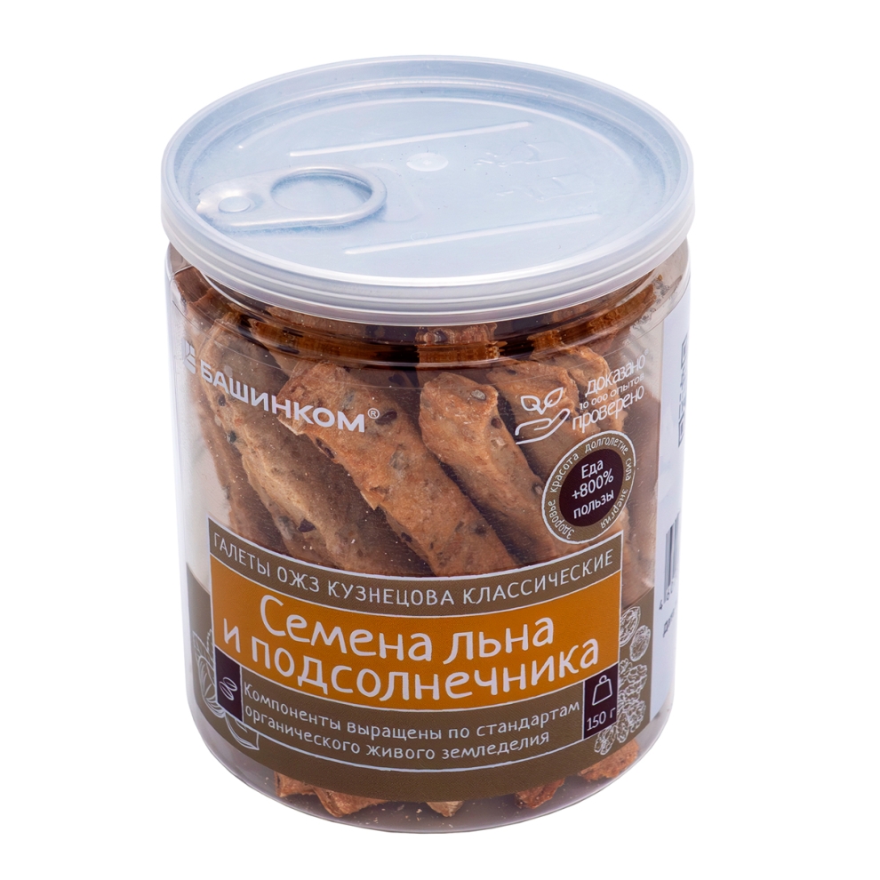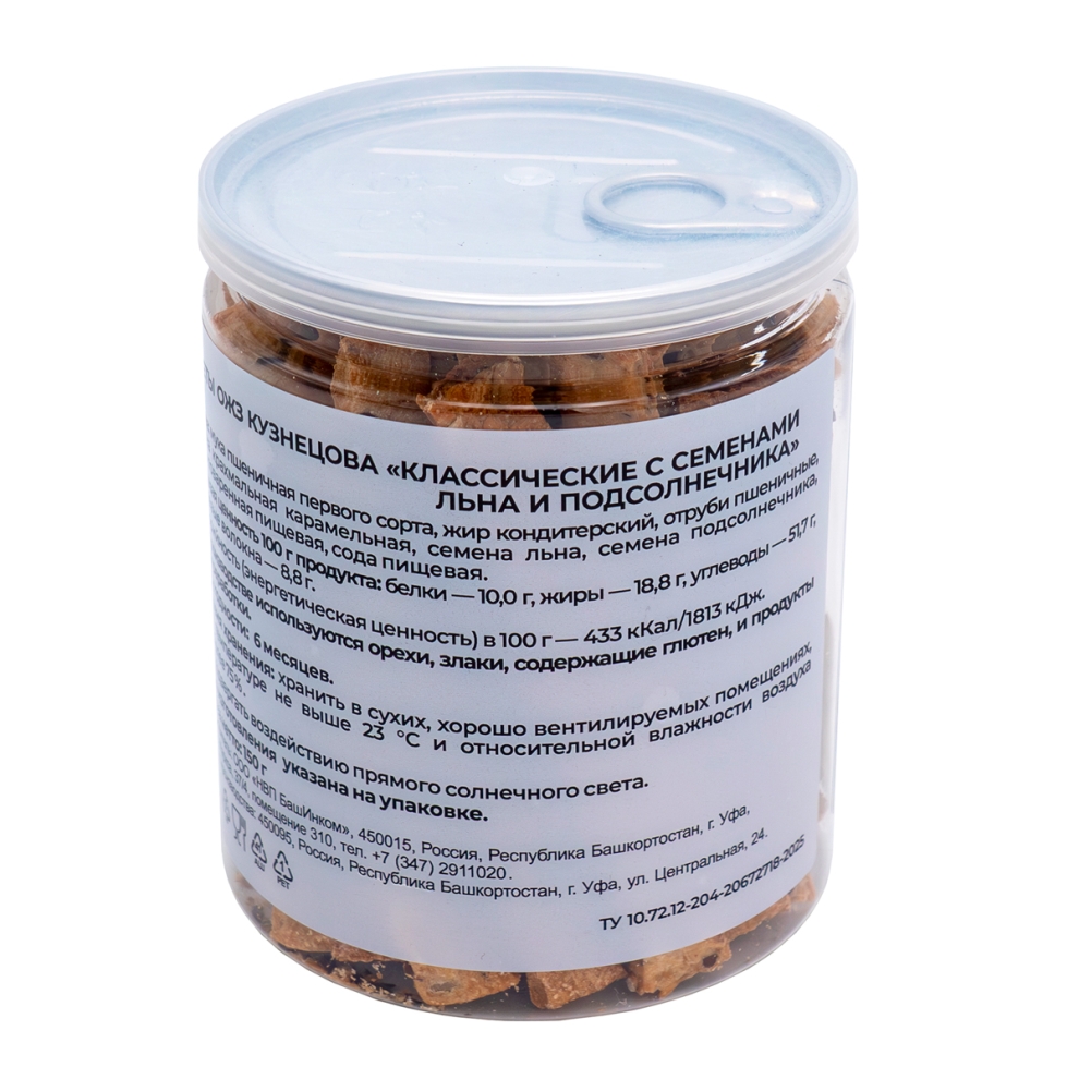 Галеты Кузнецова «Классические с семенами льна и подсолнечника»: Мука пшеничная первого сорта из зерна, выращенного по биотехнологии АС-35, отруби пшеничные, патока крахмальная карамельная, семена льна, семена подсолнечника, соль поваренная пищевая, сода пищевая.