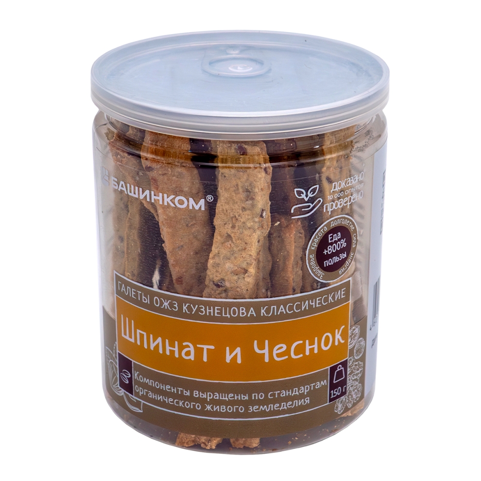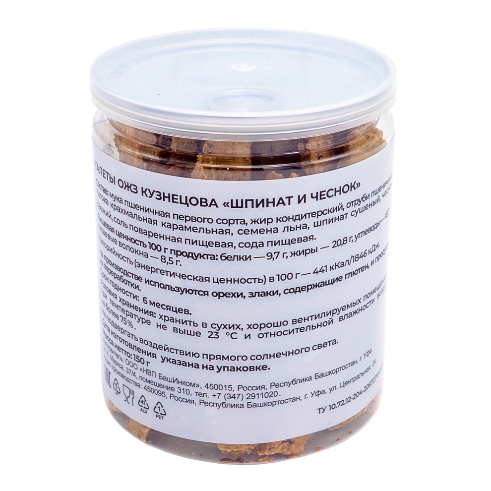 Галеты Кузнецова «Шпинат и чеснок»: Мука пшеничная первого сорта из зерна, выращенного по биотехнологии АС-35, отруби пшеничные, патока крахмальная карамельная, семена льна, шпинат сушеный, чеснок свежий, соль поваренная пищевая, сода пищевая.