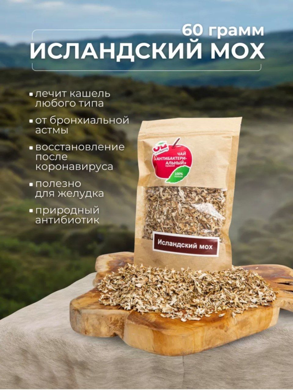 Исландский мох отличается высоким качеством и производится брендом Uralberry. Он не содержит усилителей вкуса, ГМО и ароматизаторов.