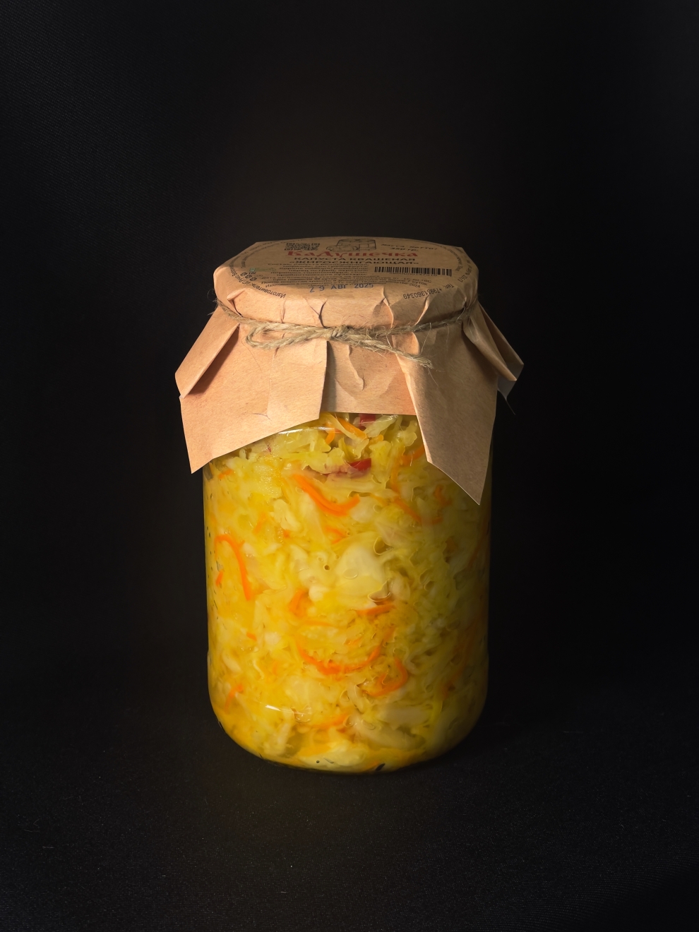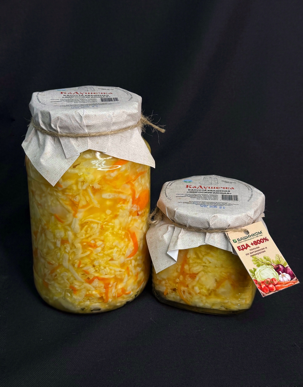 Состав: капуста белокочанная, морковь, сок грейпфрута, корень имбиря, розмарин, красный перец, соль, пробиотические культуры.