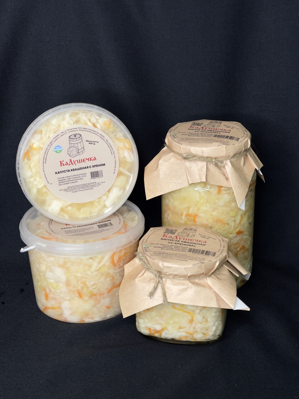 Состав: капуста белокочанная, морковь, хрен сушеный, соль, пробиотические культуры.