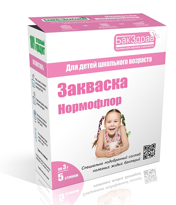 Заквасочная культура Нормофлор разработана специально для детей младшего и школьного возраста, содержит активные штаммы бактерий, свойственные микрофлоре здорового ребенка в возрасте 6-14 лет. Как известно, микрофлора человека сугубо индивидуальна и постоянно меняется в зависимости от разных факторов(окружающая среда, питание, вода, возраст и т.д.). Пробиотические культуры способны оказывать влияние на ее состав и обеспечивать идеальный баланс, где доминируют полезные микроорганизмы. Благодаря уникальному сочетанию 15-ти штаммов активных полезных микроорганизмов, работающих в симбиозе, нормализуется функциональность ЖКТ, а также активируются защитные механизмы организма. При заквашивании каждый вид бактерий синтезирует определенные полезные микроэлементы, обогащая состав готового продукта.