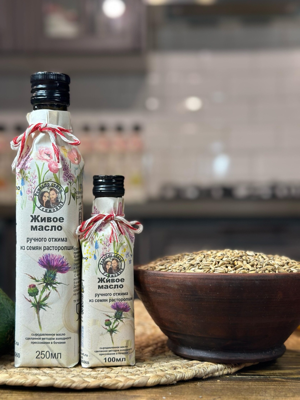 Сыродавленное масло из семян расторопши производится из высококачественного сырья методом холодного ручного прессования без нагревания. Это полностью органический продукт, сохраняющий все полезные свойства растения и не содержащий консервантов, химических красителей и ароматизаторов.